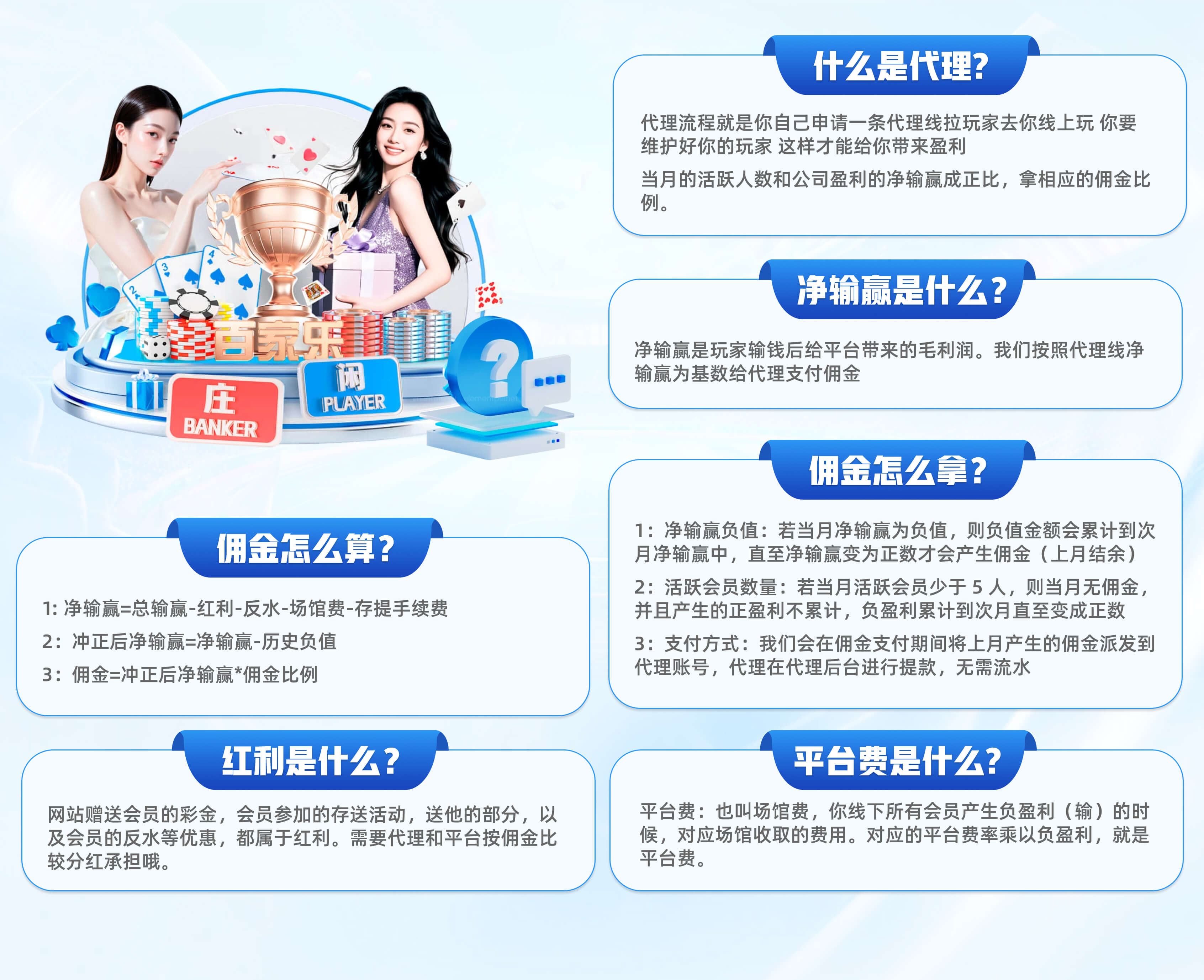 玩家无论下注百家乐、电子、彩票、足球、任何彩种,客损佣金都享受55%,做代理相当于有55%佣金+人头费+流水提成+私人福利,四层分红!佣金月结最低需要5个活跃会员。